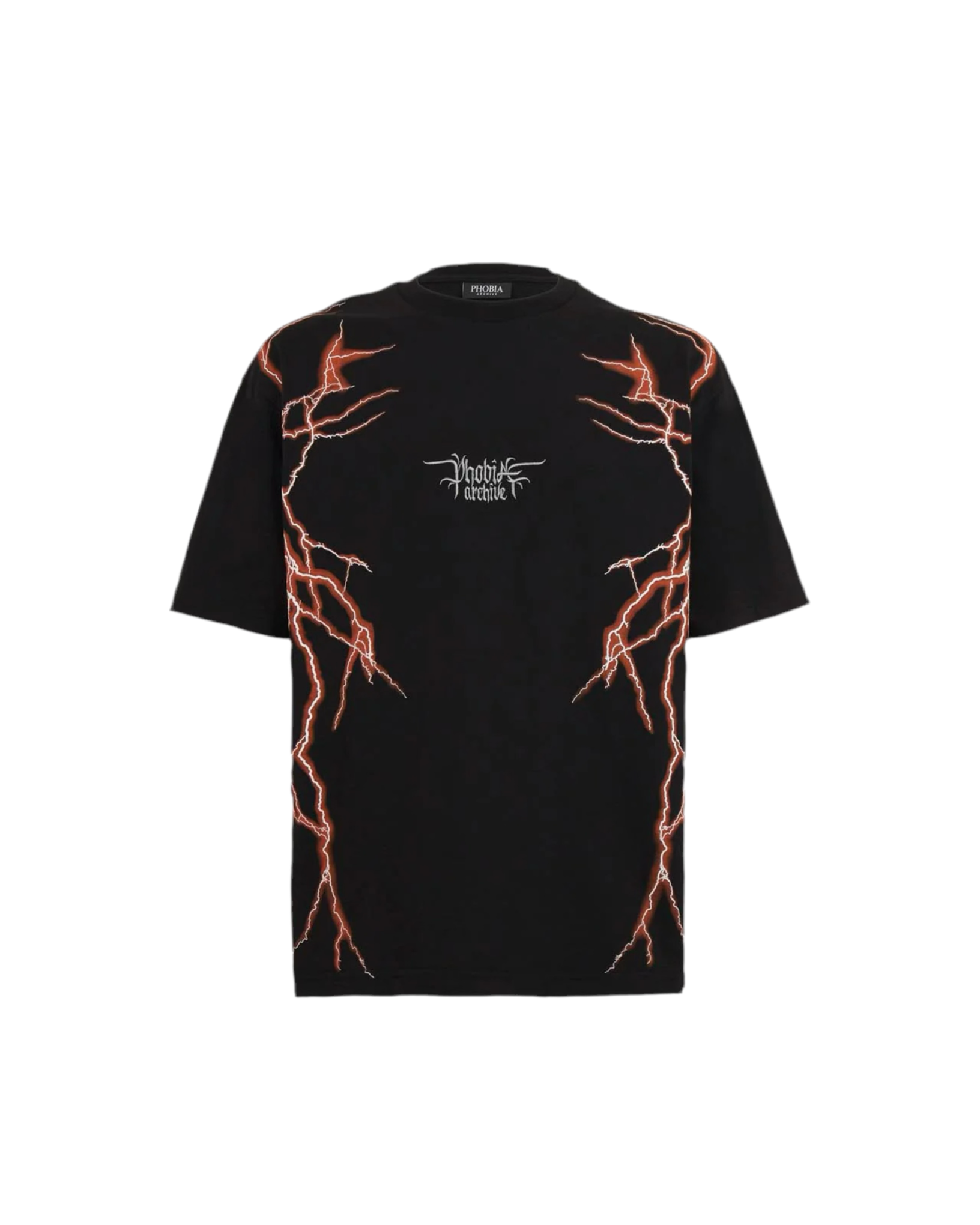 Phobia BLACK T-SHIRT WITH LATERAL ORANGE LIGHTNING PRINT AND EMBROIDERY GOTHIC LOGO